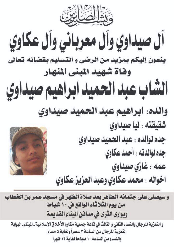 أما مدافن الميناء القديمة، فقد احتضنت جثمان الشاب عبد الحميد إبراهيم صيداوي. وفي مقبرة باب الرمل، دُفن جنبًا إلى جنب الشاب نبيل الصايغ وطفله محمد، فيما شُيّعت زوجته ناريمان البب في مسقط رأسها بخعون.